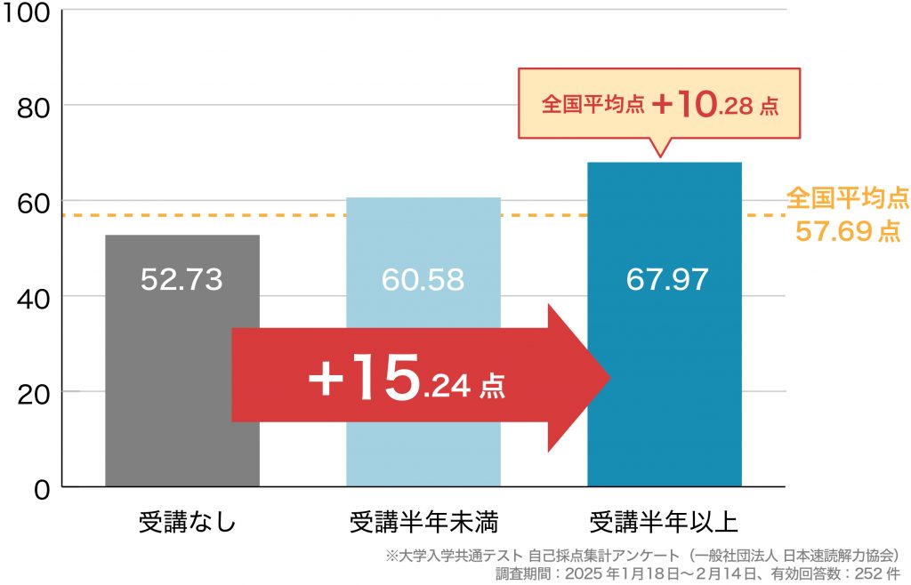 TERRACE(速読解力講座)を半年以上受講した生徒の平均点は、TERRACE非受講の生徒の平均点よりも10点以上上回る結果となりました。